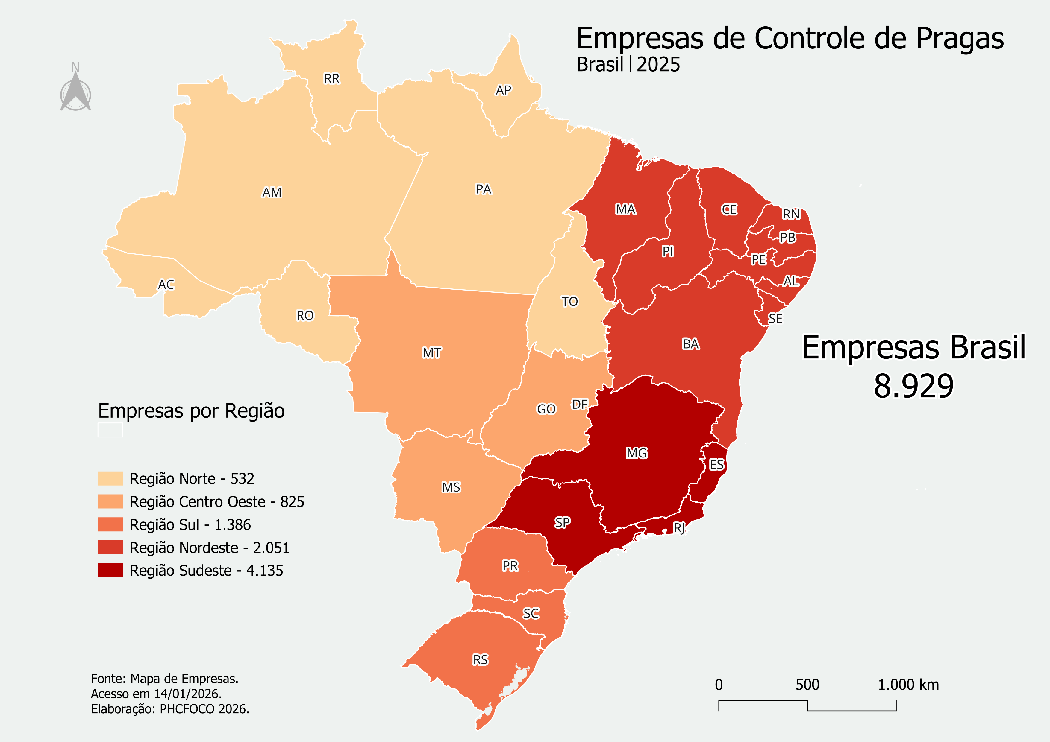 A comparação entre 2025 e 2024 evidencia a continuidade da expansão do setor de empresas de imunização e controle de pragas no Brasil, com crescimento nacional de 6%, passando de 8.450 para 8.929 empresas.