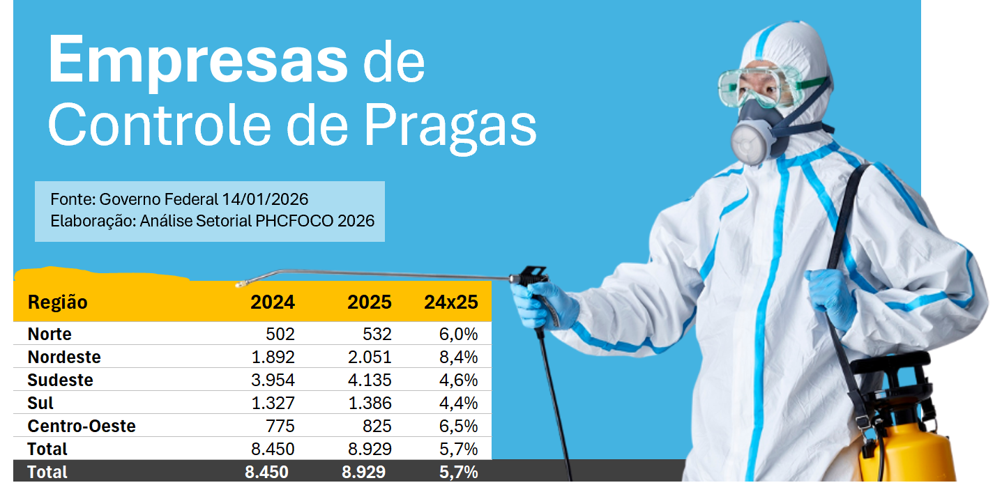 ANÁLISE /EPA A análise regional dos dados entre 2024 e 2025 indica um crescimento nacional de 5,7% no número de empresas de controle de pragas, passando de 8.450 para 8.929.