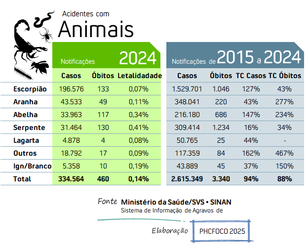 - Aranha: 43.533 casos | 49 óbitos | Letalidade: 0,11%